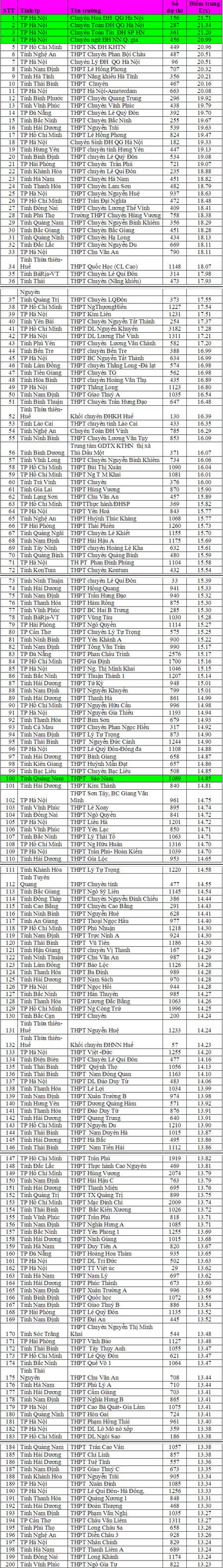 (Hiếu học) Sau khi tổng hợp kết quả tuyển sinh đại học, Cục Công nghệ Thông tin (Bộ GD&ĐT) công bố top 200 trường phổ thông có điểm thi đại học trung bình cao nhất nước. Phổ điểm của các trường này nằm trong khoảng 13,2 đến 21,7. Đáng lưu ý, trong danh sách có một trung tâm giáo dục thường xuyên, 7 trường bán công, tư thục, dân lập và 10 trường mang tên danh nhân Lê Quý Đôn. Dẫn đầu danh sách là khối các trường chuyên thuộc ĐHQG Hà Nội…