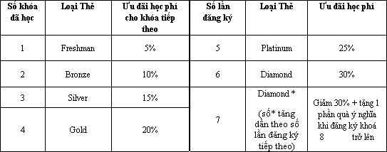 – HV cũ khi đến Aston đăng ký học lại trong thời gian của chương trình này sẽ được hưởng chế độ “Thẻ thành viên Aston” tính theo số khóa học đã theo học trước đây (chi tiết ở mục 2):
