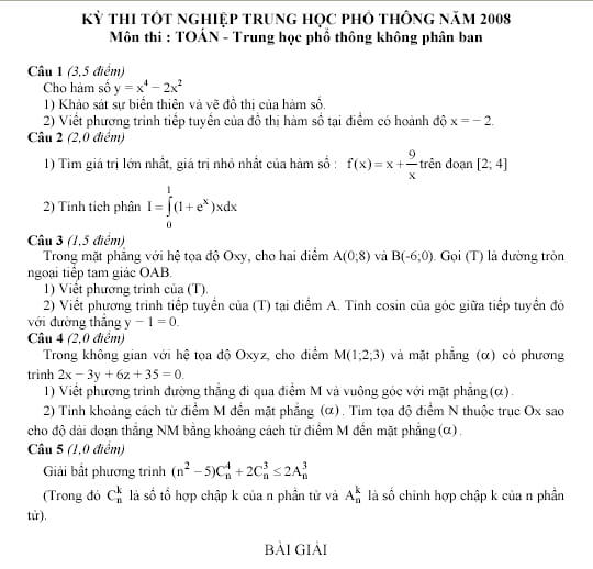 Mời các bạn thí sinh xem gợi ý tham khảo giải đề thi môn toán trong kỳ thi tốt nghiệp THPT năm học 2007-2008 chương trình không phân ban (những gợi ý này chỉ có tính chất tham khảo).