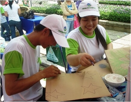 Các bạn trẻ tập thiết kế bao bì tái sử dụng tại ngày hội tái chế 2010 (Ảnh: Hoài Nam)