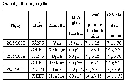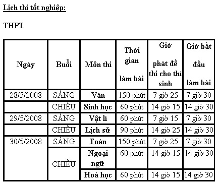 Kỳ thi sẽ diễn ra trong 3 ngày, từ 28-30/5/2008. Thí sinh, giám thị vi phạm sẽ đều bị xử lý nghiêm. Thí sinh mang tài liệu, vật dụng không được phép vào phòng thi dù chưa sử dụng cũng vẫn bị xử lý.