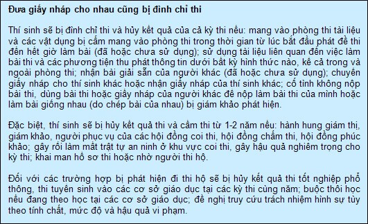 Ngoài ra, với tất cả các môn thi dù là tự luận hay trắc nghiệm, khi nhận đề thi thí sinh phải kiểm soát kỹ số trang và chất lượng các trang in. Nếu phát hiện thấy đề thiếu trang hoặc rách, hỏng, nhòe, mờ phải báo cáo ngay với giám thị phòng thi, chậm nhất 15 phút sau khi phát đề. Khi làm bài, tuyệt đối không được trao đổi, bàn bạc, quay cóp hoặc có những cử chỉ, hành động gian lận và làm mất trật tự phòng thi.