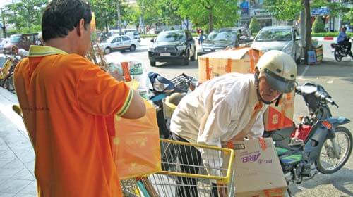 Anh Liêm Trúc Lâm, quản lý bán hàng của siêu thị Maximark Cộng Hòa (Q.Tân Bình, TP.HCM), cho biết từ khi thành lập năm 2001 đến nay, siêu thị đã triển khai dịch vụ giao hàng tận nơi cho khách hàng. Trong những năm gần đây, dịch vụ này phát triển mạnh do nhu cầu ngày một nhiều hơn với hầu hết mặt hàng. Mỗi ngày từ 9g sáng, anh trưởng nhóm Thái Liên Trung tập hợp bốn anh em còn lại trước cửa siêu thị để bắt đầu một ngày làm việc. Người có thâm niên ít nhất là hai năm, lâu nhất là năm năm.