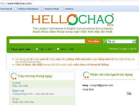 (Hiếu học). Việc dịch câu từ tiếng Việt sang tiếng Anh (hoặc Anh-Việt) trong viết và đàm thoại thường không dễ dàng với những người mới học tiếng Anh. Website HelloChao có thể giúp bạn trong việc tra cứu những câu nói hoàn chỉnh từ tiếng Anh và tiếng Việt. Hiện khá nhiều sinh viên xem đây như một cuốn từ điển ảo giúp họ nâng cao trình độ tiếng Anh và tăng cường khả năng giao tiếp của mình.